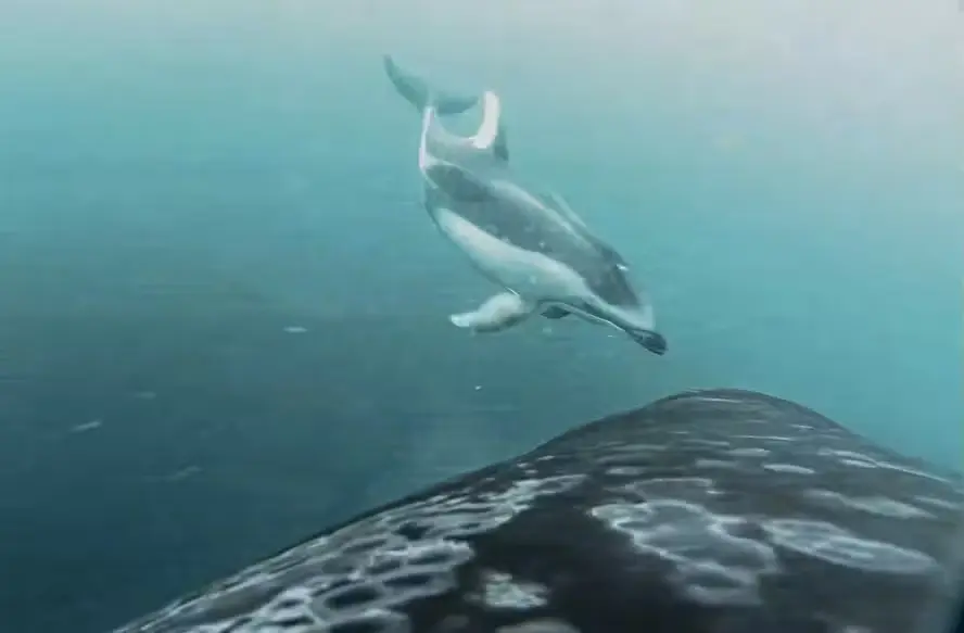 À primeira vista, as interações observadas da superfície pareciam desordenadas, mas as imagens e gravações subaquáticas revelaram sincronia entre as espécies. Os cientistas constataram que orcas e golfinhos mergulham lado a lado; quando os golfinhos iniciam um mergulho, as orcas repetem o movimento.