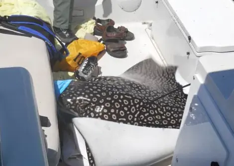 Uma arraia de 90 quilos pulou dentro de um barco que navegava em Islamorada, no estado da Flórida (EUA), e caiu sobre uma mulher, segundo reportagem da emissora de TV “CBS 4”.
