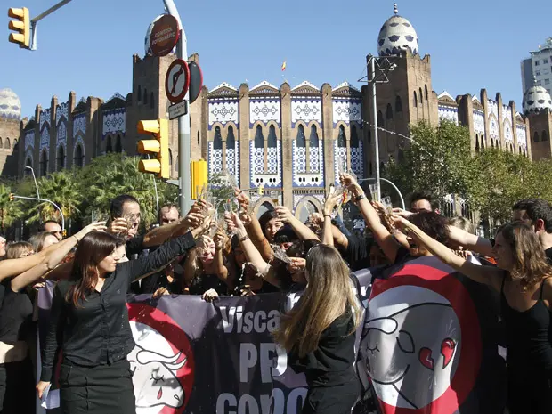Ativistas da organização Anima Naturalis comemoraram com brindes a última das “corridas” na região espanhola em frente à arena em Barcelona.