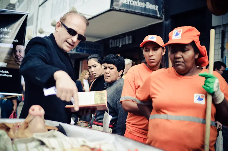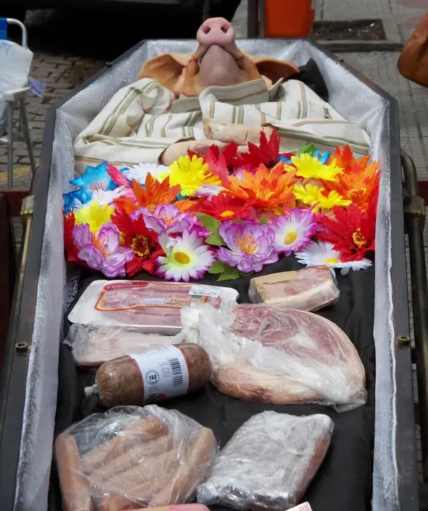 Na Rua Independência, principal rua da cidade, os pedestres foram surpreendidos por um cenário incomum e um tanto grotesco: ativistas enlutados em torno de um caixão velando um porco de terno com as patas entrelaçadas tal como um defunto, enfeitado com flores decorativas e produtos alimentícios suínos (salsicha, bacon, linguiça etc) e perto disso um banner com fotos de um menino com síndrome de Down e seu porquinho de estimação.