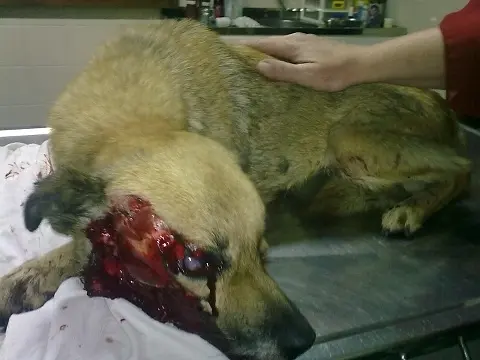 Hoje eu estava na correria com os peludos, vindo da Ulbra, pois tinha levado uns cães machos para castração e quando passava na estação Mathias Velho, em frente ao Nacional, com uma amiga, olhei para o lado e vi uma cena de filme de terror: uma cadelinha esquelética com o rostinho todo desfigurado e um olho pendurado.