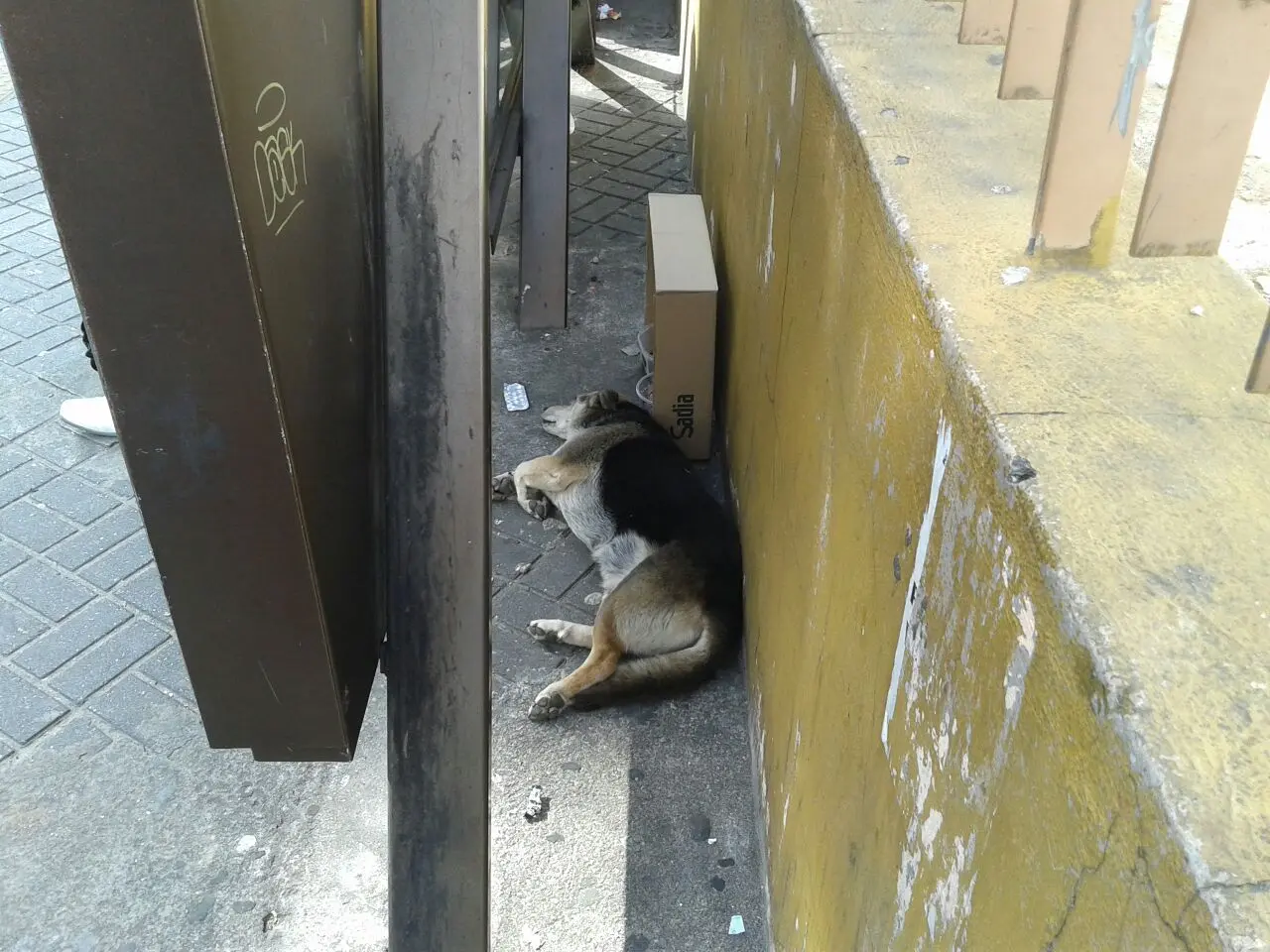 Um cachorrinho sem raça definida está recebendo alimento e água dos moradores da região, mas precisa ser resgatado.