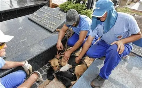 As coisas começaram a mudar depois que a cadela engravidou e pariu seus oito filhotes dentro de um túmulo abandonado, há 15 dias. Desde então, Lady passou a rosnar ameaçadoramente para quem passasse por “sua” área, e atacou pelo menos dois frequentadores do cemitério.