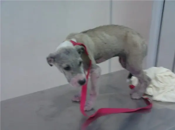 5 meses, a vet não sabe se é pit bull ou dog alemão, pois ela está magrela (desnutrição e inchada devido descalcificação), sarna negra, desnutrição e desidratação, inflamações devido a lesões da sarna. Falta de cálcio devido a má alimentação, por este motivo as patas estão inchadas, ela não consegue andar devido à desnutrição e fraqueza (cálcio) dos ossos. Inclusive o risco de fratura é grande.