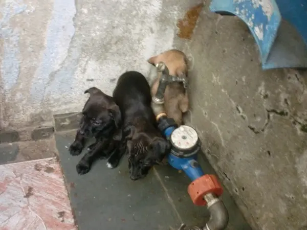 Essa cadela e seus nove filhotes estão sem água e sem ração em lugar muito sujo. Seus tutores são alcoólatras e muito pobres; estão sem água (foi cortada) e sem sabaão para lavar o local.