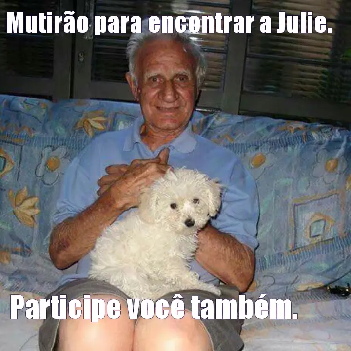 A cadela da imagem se chama Julie. Ela se perdeu em 14/8 na Rua Comendador Oeterer próximo do Viaduto dos Ferroviários-Centro, em Sorocaba (SP). Seu tutor Sílvio está muito triste e sente muita falta dela. Se tiver alguma informação sobre a Julie entre em contato com Gilda ou Luciano.