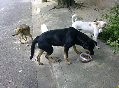 Esta cachorra preta está no cio e precisa ser resgatada com urgência. Os moradores estão maltratando a cadela e os outros cães abandonados que estão na rua.