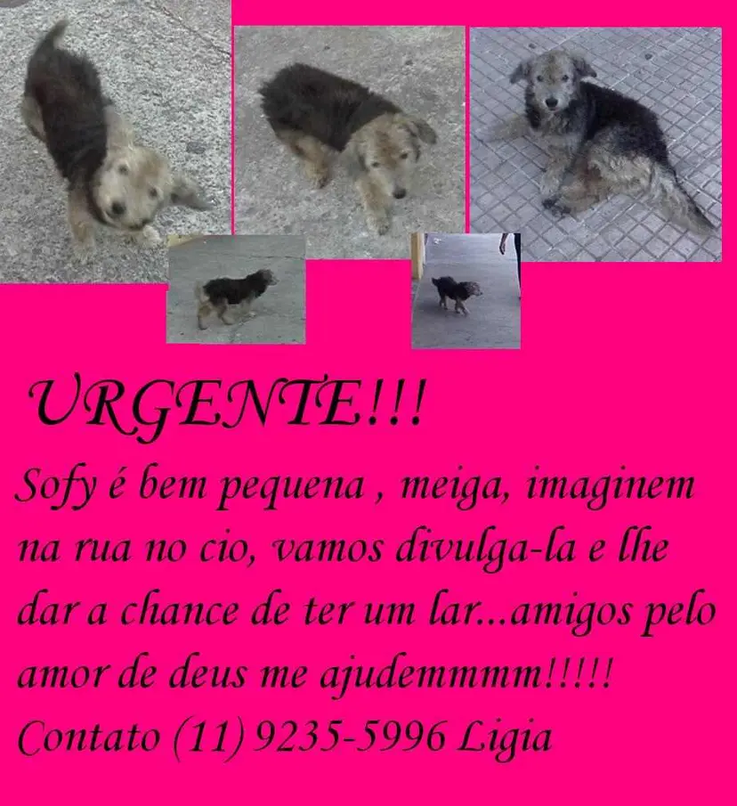 Recebi uma ligação da D. Antonia que é diarista, uma senhora muito simples que me ligou de um telefone público e nem soube me dizer ao certo quem foi a moça que deu meu telefone a ela, mas ela me implorava ajuda a uma cachorrinha que ela chama de Sofy que fica sempre no ponto de ônibus, próximo de onde ela trabalha na Vila Jaguará.