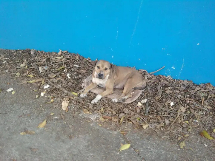 Essa linda cadelinha da raça pit bull foi abandonada há 3 dias nesta rua do bairro do Socorro (SP).