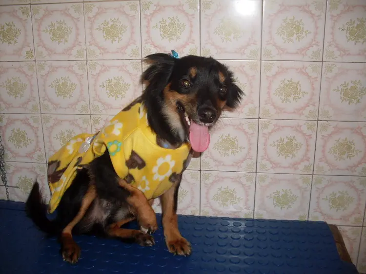 Esta cadela foi resgatada de um sítio com um tiro na patinha da frente, que ficou “com defeito”. Ela estava esperando filhotes e perdeu, mas agora ela já está bem.