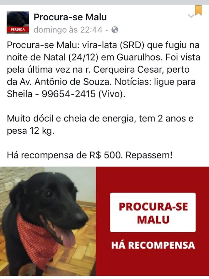 A cadela da imagem se chama Malu. Fugiu do local onde estava hospedada no dia 24/12 em Guarulhos (SP). Foi vista pela última vez na rua Cerqueira Cesar, no Centro. Quem tiver informações sobre o paradeiro dela entre em contato com a Sheila através do tel: 11 – 99654 – 2415.