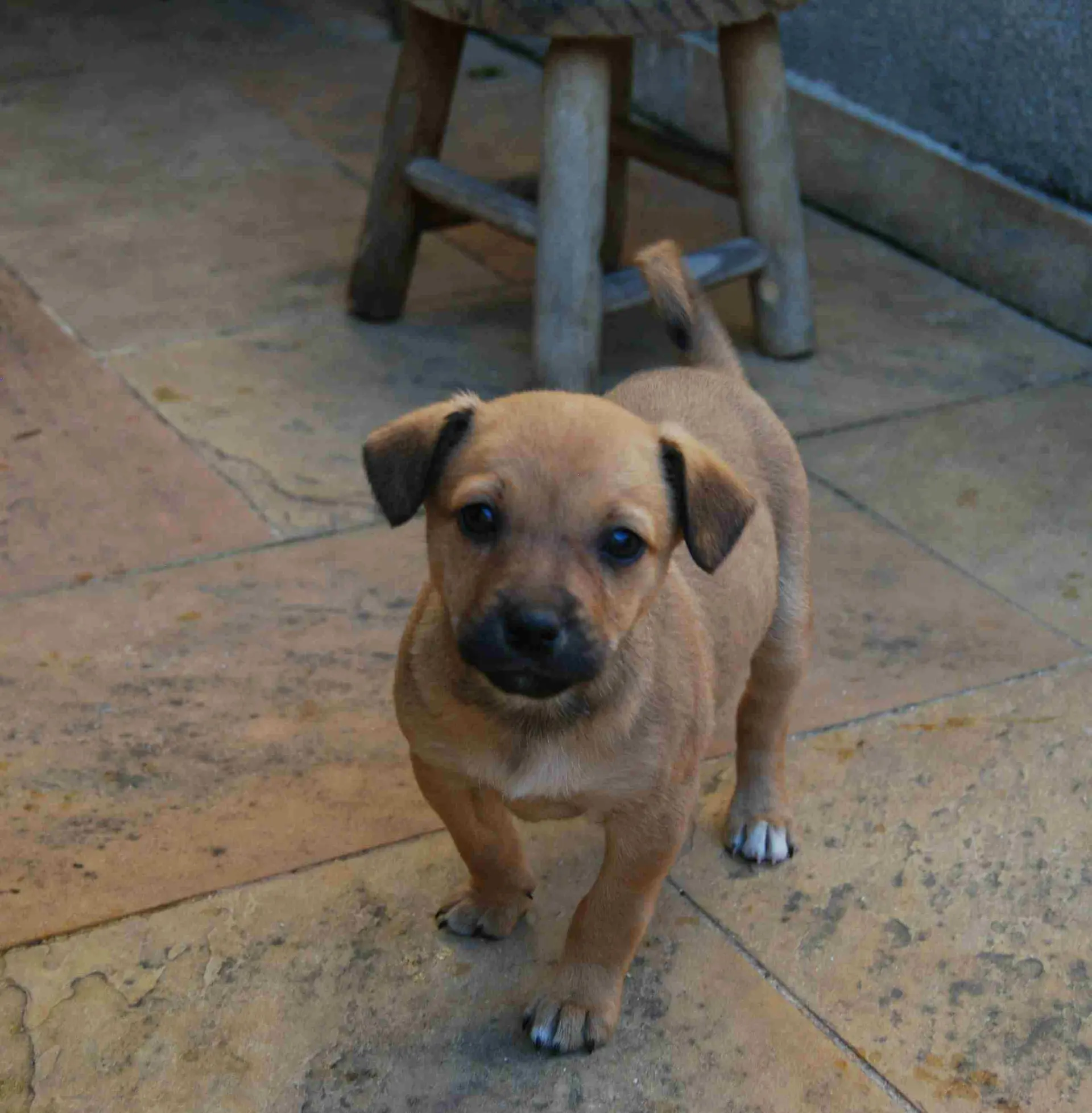 Cadelas filhotes, sendo três da raça pinscher e mestiças com olhos esverdeados e uma da raça border collie também mestiça de aproximadamente 9 meses esperam por adoção.