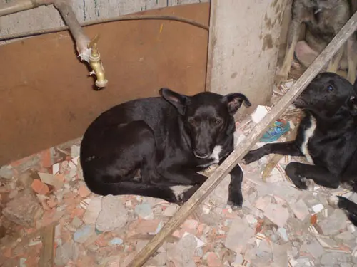 Uma sra que as alimenta pediu para que fizessem um buraco no barraco para que elas pudessem entrar e ficarem um pouco protegidas. Elas permanecem quase o tempo todo lá dentro. Logo esse barraco vai ser vendido pela filha da dona que não quer nem saber das cachorras.