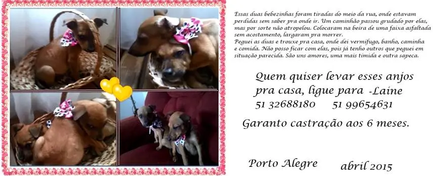 As cadelas da imagem foram encontradas em situação de abandono nas ruas de Porto Alegre, RS. Estão e lar temporário e já foram vermifugadas e higienizadas. A pessoa que as resgatou não poderá adotá-las, pois já tutela muitos animais. Interessados em adotá-las entre em contato a Laine através do telefone disponibilizado no cartaz abaixo.