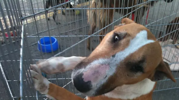 Esses cães que a Karine resgatou viviam em uma chácara, onde não eram devidamente cuidados. São 3 borzois. A da foto é uma fêmea, meiga e muito doce, serve até para apartamento de tão calma. E a Bull Terrier é super mansa e meiga, aceita outros animais, gosta de crianças e de colo.