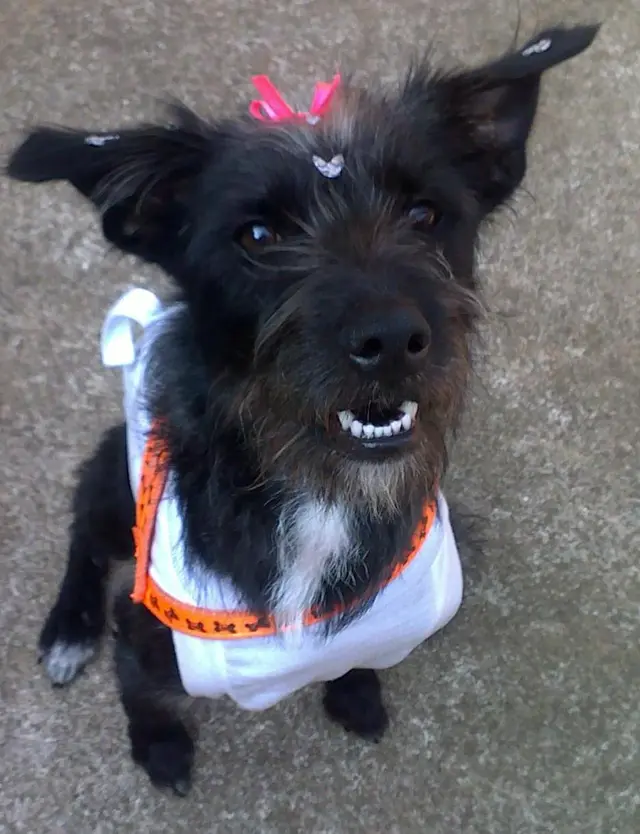 Ela é muito dócil, se dá muito bem com outros animais, inclusive gatos. SRD, tem porte pequeno/médio e é preta com uma mecha branca na cabeça.