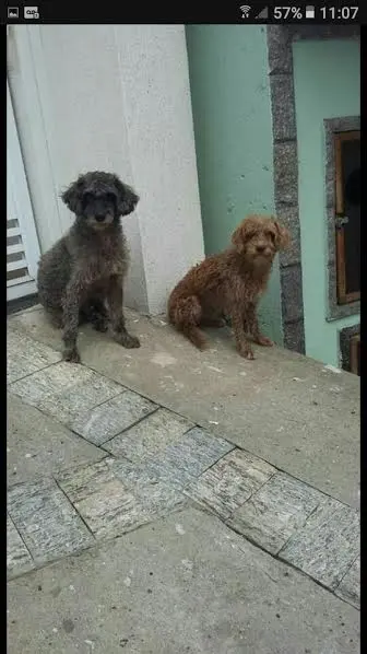 Dois cães foram abandonados juntos na rua das Rosas, em Vila Valqueire, na zona Oeste do Rio. Eles estão tristes, assustados e não aceitam comer ração. Precisam de resgate e abrigo, pois estão desprotegidos do sol e da chuva.