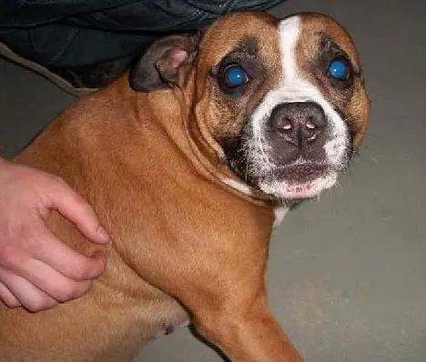 Celia Hammond disse-me sobre um filhote staffie que teve as quatro patinhas quebradas e fora cegada pela tutora, e então foi abandonada.