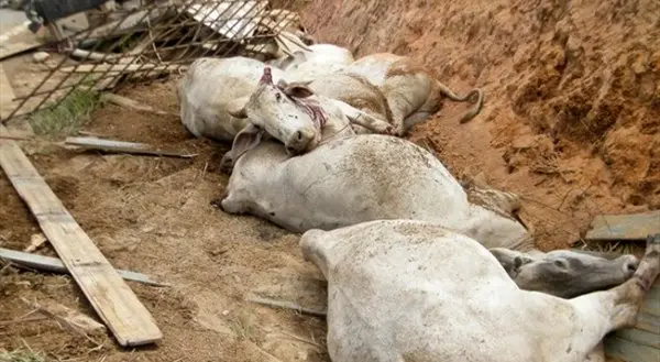 O caminhão estava transportando 20 bois e no tombamento a maioria morreu.
