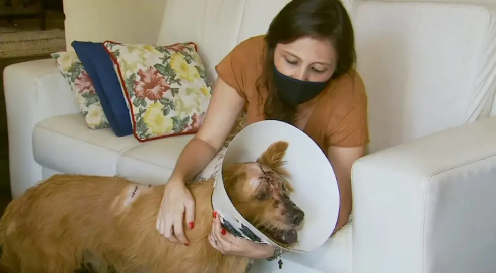 O cachorro ficou com ferimentos na cabeça devido às agressões. Após ser liberado para a tutora, ela relatou emoção ao buscá-lo no veterinário e também choque quando soube do que aconteceu com o animal doméstico.
