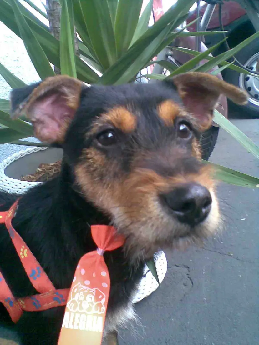 Sou um lindo macho, filhote de 6 meses, mestiço com terrier na combinação das cores preta, marrom e bege.