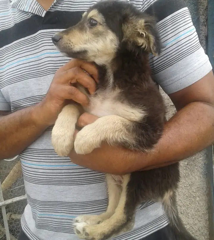 O cachorro tem cerca de 2 meses e é de porte médio. Ele é dócil e carinhoso e precisa, com urgência, de adoção responsável.