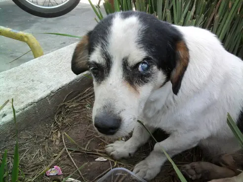 Ele é cego, muito provavel foi descartado como um saquinho de lixo. Fui ve-lo para tirar foto e postar na internet. Porém eu e minha amiga Leni, não conseguimos deixa-lo lá deitado no jardim do Banco, provavelmente morreria de fome ou atropelado.