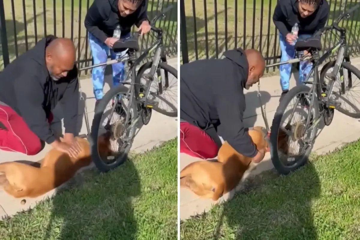 Uma mulher, que não quis se identificar, saiu para passear com seu um cão da raça Boxer, preso à sua bicicleta. O animal acabou desmaiando na calçada em frente a um parque para cães.