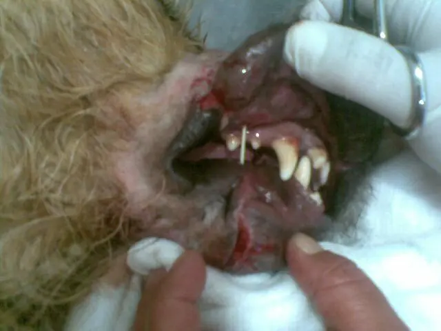 O Lobinho foi atendido pela Dra. Andreza Campos. Foi sedado para limpeza e curativo, onde foi descoberto um material elástico ainda prendendo seu focinho que o atravessou até atingir a gengiva. Era aparte de um preservativo que um deliquente colocou na boca do cão.
