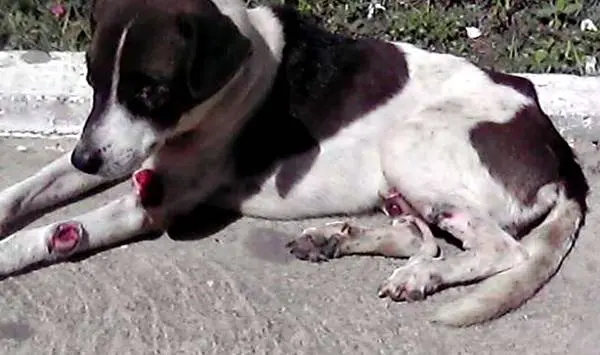 Este cachorro branco com manchas marrons está com várias feridas espalhadas pelo corpo. Ele precisa de resgate urgente.
