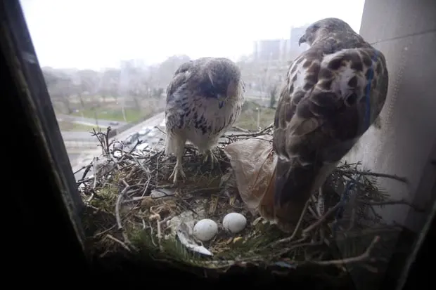 Um casal de falcões construiu seu ninho no parapeito de uma janela do museu de ciências da cidade da Filadélfia, no estado da Pensilvânia (EUA).