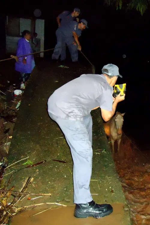 Com auxílio da corda que envolvia o pescoço do animal, os bombeiros conseguiram encaminhar o cavalo a um local mais próximo da margem, onde puderam finalmente removê-lo da área de risco.
