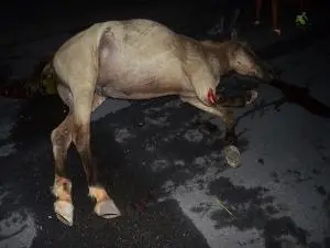 O cavalo atingiu a parte esquerda do veículo e até o teto acima do condutor, que foi atingido na cabeça. O animal teve uma fratura exposta na pata dianteira direita e morreu na hora.