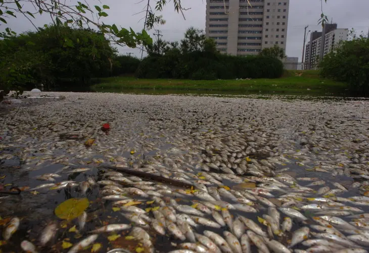 O fato ocorre desde o fim da tarde de ontem, mas se intensificou nesta manhã. Os animais boiavam entre garrafas, sacolas plásticas e outros dejetos.