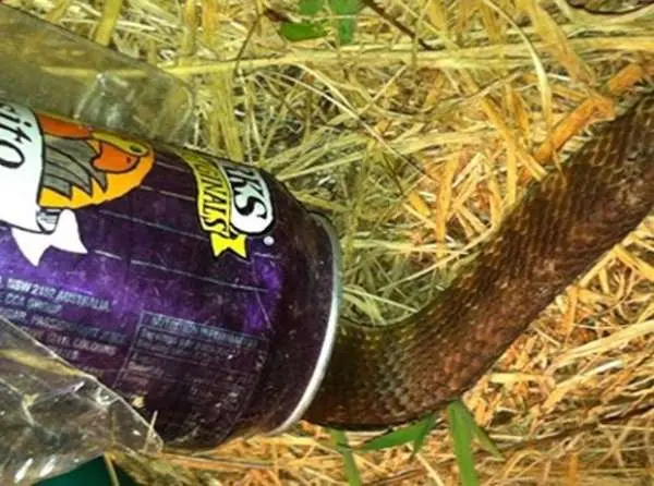 Uma cobra-tigre foi encontrada presa em uma lata de refrigerante em Thurgoona, na Austrália, segundo o jornal “Border Mail”.