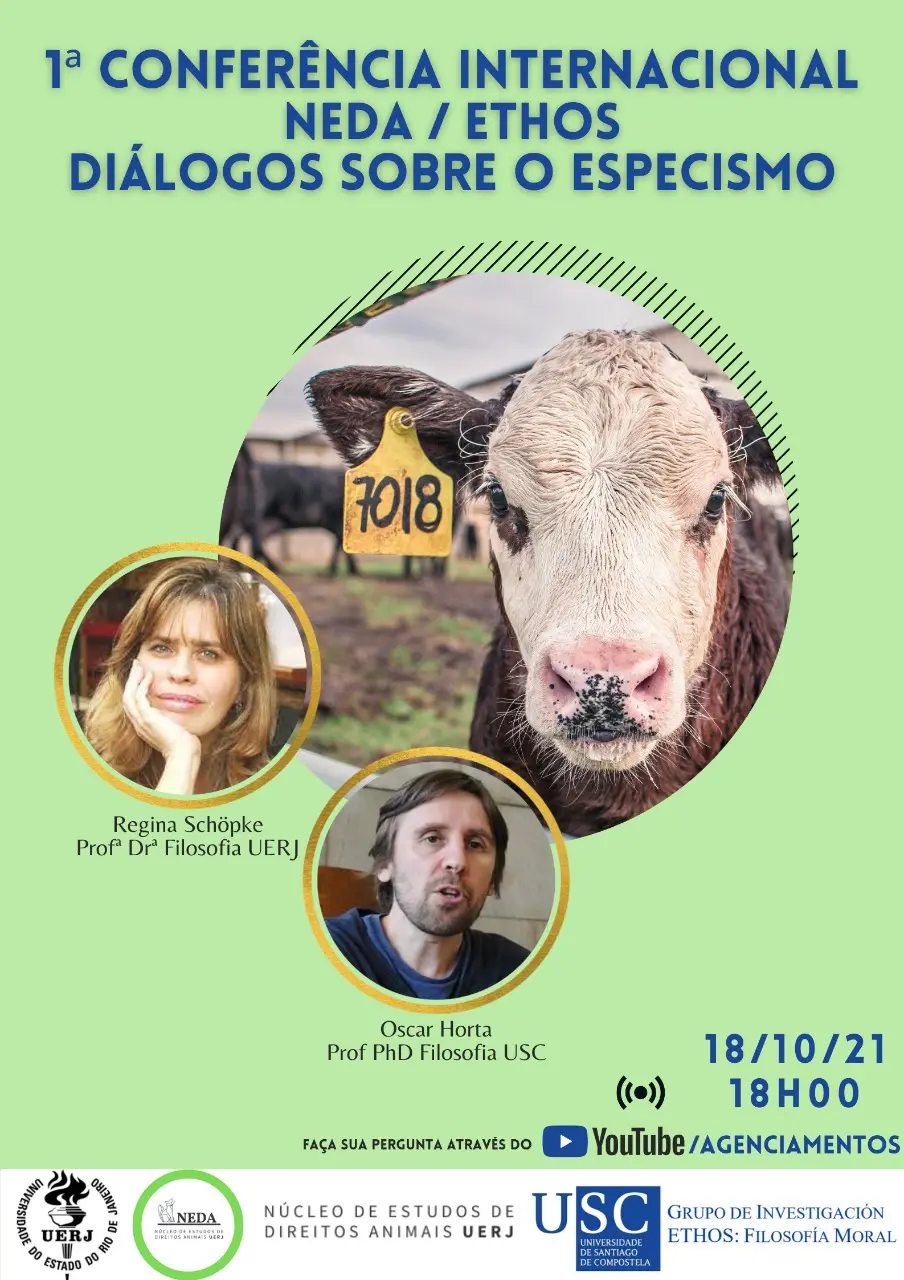 O Núcleo de Estudos de Direitos Animais (NEDA), vinculado ao Departamento de Filosofia da UERJ, coordenado pela Profa. Dra. Regina Schöpke, e o grupo ETHOS: Filosofia Moral, vinculado ao Departamento de Filosofía y Antropología, da Universidade de Santiago de Compostela (USC), coordenado pelo Prof. PhD em Filosofia Oscar Horta, realizarão no dia 18 de outubro, às 18h, a primeira edição da Conferência Internacional NEDA/ETHOS Diálogos pelo Especismo. O evento será transmitido online pelo canal da Agenciamentos Contemporâneos no YouTube. É gratuito e aberto para perguntas.