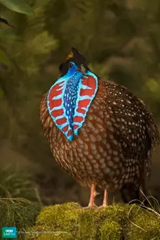 Este pássaro impressionante é encontrado nas florestas do sul da Ásia. Ele tem um topete laranja e marrom e seu peito parece um tubarão-baleia deitado em cima de um coração. A cor azul de seu rosto é realmente a sua pele, e não penas. Não é nenhuma surpresa que ele seja considerado o faisão mais bonito do mundo.