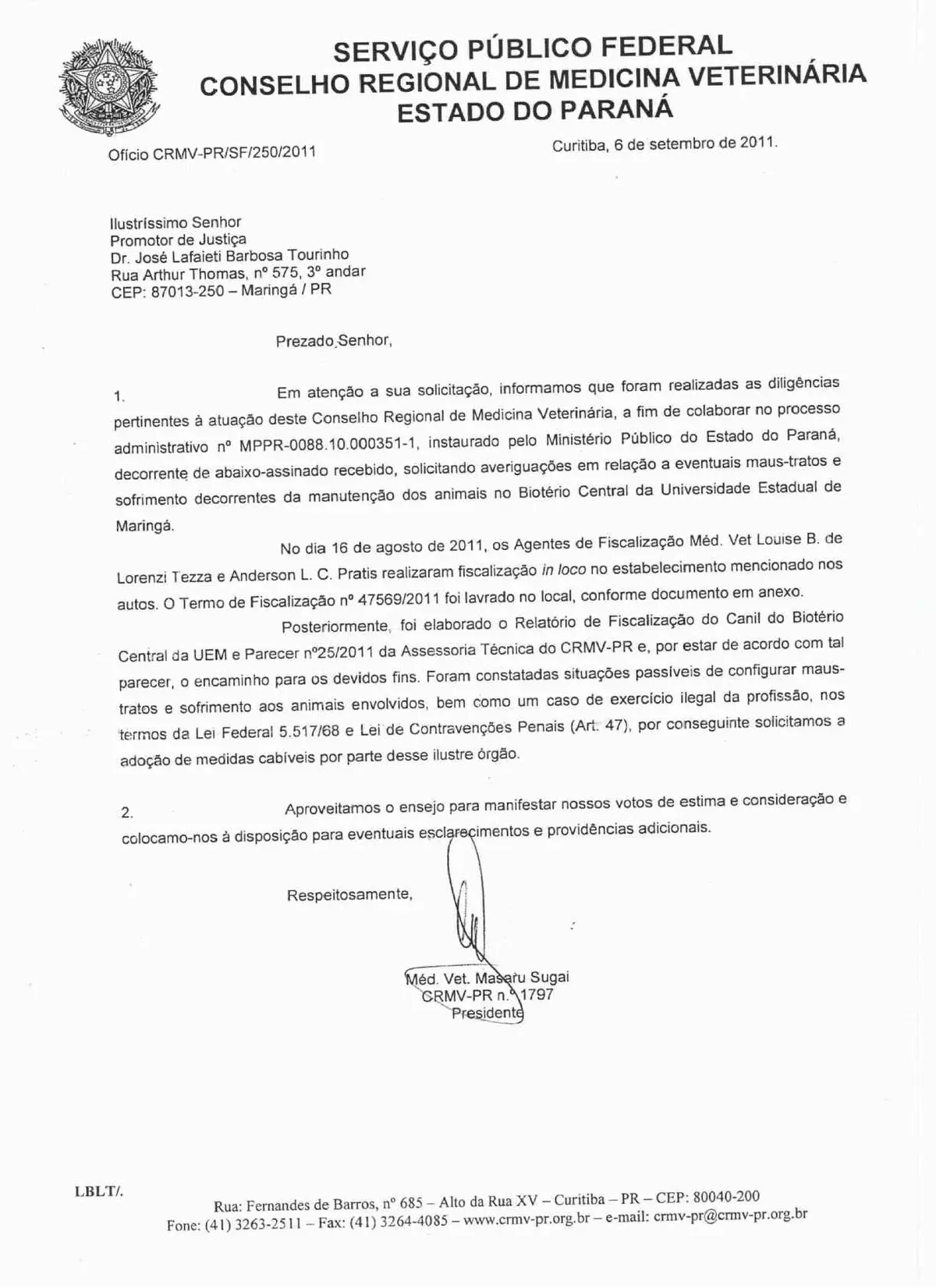 Em relação ao Parecer solicitado pelo Ilustríssimo Promotor de Justiça Dr. José Lafaieti Barbosa Tourinho, em relação ao uso de cães em experimentos da Universidade Estadual de Maringá, e à possibilidade dos mesmos estarem passando por sofrimento, “stress” e traumas decorrentes da condição de cativeiro, bem como requisitando informações a respeito de métodos alternativos para as experiências mencionadas, temos a esclarecer que tal material já foi cuidadosamente elaborado e enviado ao Digníssimo Promotor, inclusive já tendo sido entregue pelos correios às 8h45 do dia 14/09/2011. O tempo necessário para a elaboração dos documentos deveu-se à gravidade da questão e à grande importância concedida por este Órgão à situação apresentada, buscando-se produzir um material acurado, detalhado e com máxima fundamentação científica.