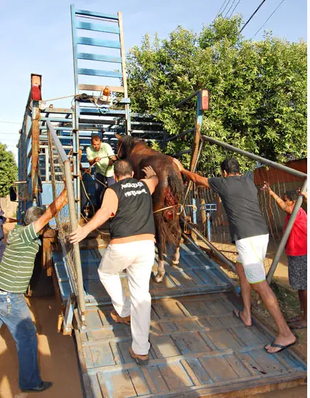 O caminhão que recolhe animais chegou às 16h. Foram necessários cinco homens para empurrar a égua até o veículo. O sofrimento do bicho comoveu moradores que observaram a cena.