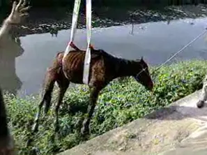 Uma égua que estava pastando às margens do Arroio Dilúvio, em Porto Alegre (RS), acabou caindo na água nesta quinta-feira (2). Com o auxílio de um guincho, o animal foi resgatado sem ferimentos.