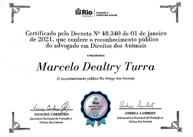 O escritório Marcelo Dealtry Turra Advocacia, especializado em Direito Animal, foi o primeiro a receber o selo de responsabilidade social Rio Amigo dos Animais, criado pela Prefeitura do Rio de Janeiro através da Secretaria Municipal de Proteção e Defesa dos Animais (SMPDA). A honraria foi concedida nesta quinta-feira (14).