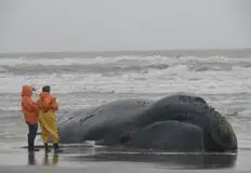 Quinta-feira, 9. A baleia-franca encalhada apresenta sinais de exaustão. Para evitar que o animal fique desidratado, especialistas jogam água sobre o corpo do mamífero. Eles se esforçam para resgatar o animal, mas a operação se mostra complicada pela localização da baleia. O uso de rebocadores é descartado, porque os barcos não conseguiriam chegar próximo o suficiente do local onde a baleia está. Diminuem as chances de sobrevivência do animal, que mede 15,80 metros e pesa entre 40 e 50 toneladas.