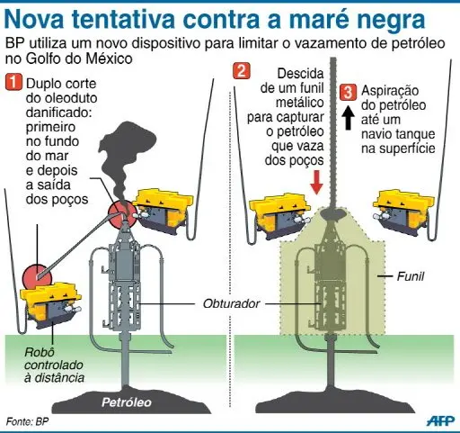 Enquanto isso, os engenheiros da British Petroleum (BP) preveem, agora, colocar um funil com o propósito de recuperar o petróleo que vaza a 1.500 metros de profundidade e armazená-lo em um barco na superfície.