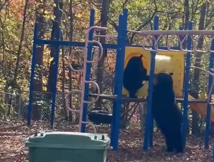 Num parque infantil à beira da floresta, uma família peluda desfrutava de momentos agradáveis juntos. Era uma ursa e seus três filhotes aproveitando ao máximo a área de recreação, tal como uma família humana faria.