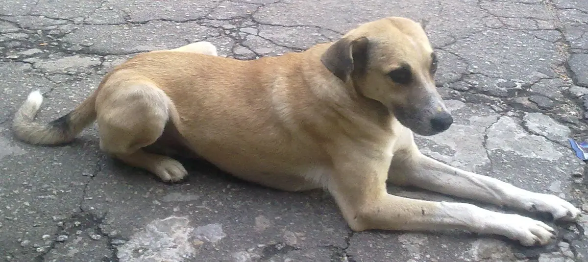 Esse vira-lata cor amarelo claro se perdeu na nova Itanhaém, em SP, do lado do morro no dia 26 de fevereiro.