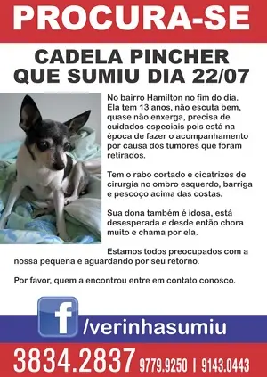 A Verinha foi resgatada e se salvou de uma eutanásia que sua antiga tutora faria. Fez uma cirurgia super delicada para a retirada de tumores e se recuperou bem. Saiu do abandono para uma família super cuidadosa e amorosa que a acolheu e proporcionou todos os cuidados e mimos. Ela usava um vestido vermelho e amarelo no dia em que desapareceu. Ela é preta e branca, possui cicatrizes na barriga, ombro esquerdo e nas costas acima do pescoço. Tem o rabo cortado, quase não enxerga e escuta pouquíssimo. Tem aproximadamente 13 anos.