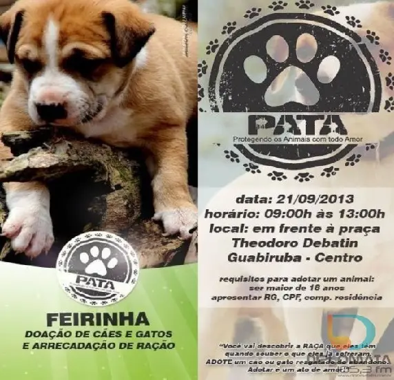 No sábado (21) a PATA-Protegendo os Animais com Todo Amor realiza sua 1º feirinha de doação de animais, em frente à Praça Theodoro Debatin, Centro de Guabiruba (SC), das 9h às 13h.