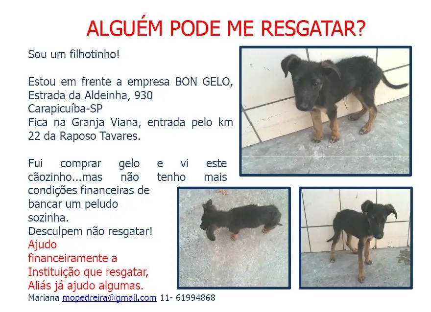 Este cãozinho filhote foi abandonado em Carapicuíba, SP. Ele está em frente à empresa Bon Gela, Estrada da Aldeinha, 930. Fica na Granja Viana, próx ao km 22 da Raposo Tavares. Está muito magro.