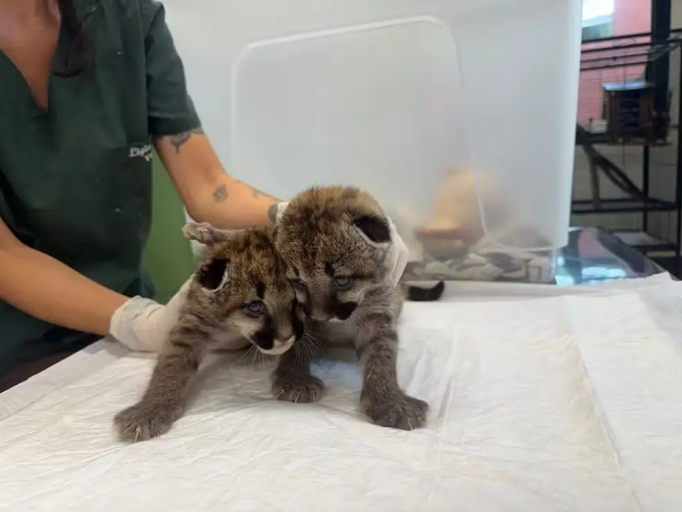 Os dois filhotes de onça-parda, que estão órfãos após serem resgatados no dia 10 de outubro por funcionários de uma usina durante a colheita de cana-de-açúcar, em Monte Aprazível (SP), são alimentados a cada duas horas com mamadeiras e não têm previsão de retorno à natureza.
