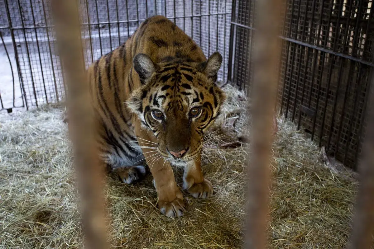 Presa em uma gaiola minúscula, cercada por leões e tigres maiores, Flora vivia sem qualquer possibilidade de se esconder ou escapar. Essa imagem da tigresa encolhida em meio a rugidos e sombras reflete o impacto do cativeiro prolongado.
